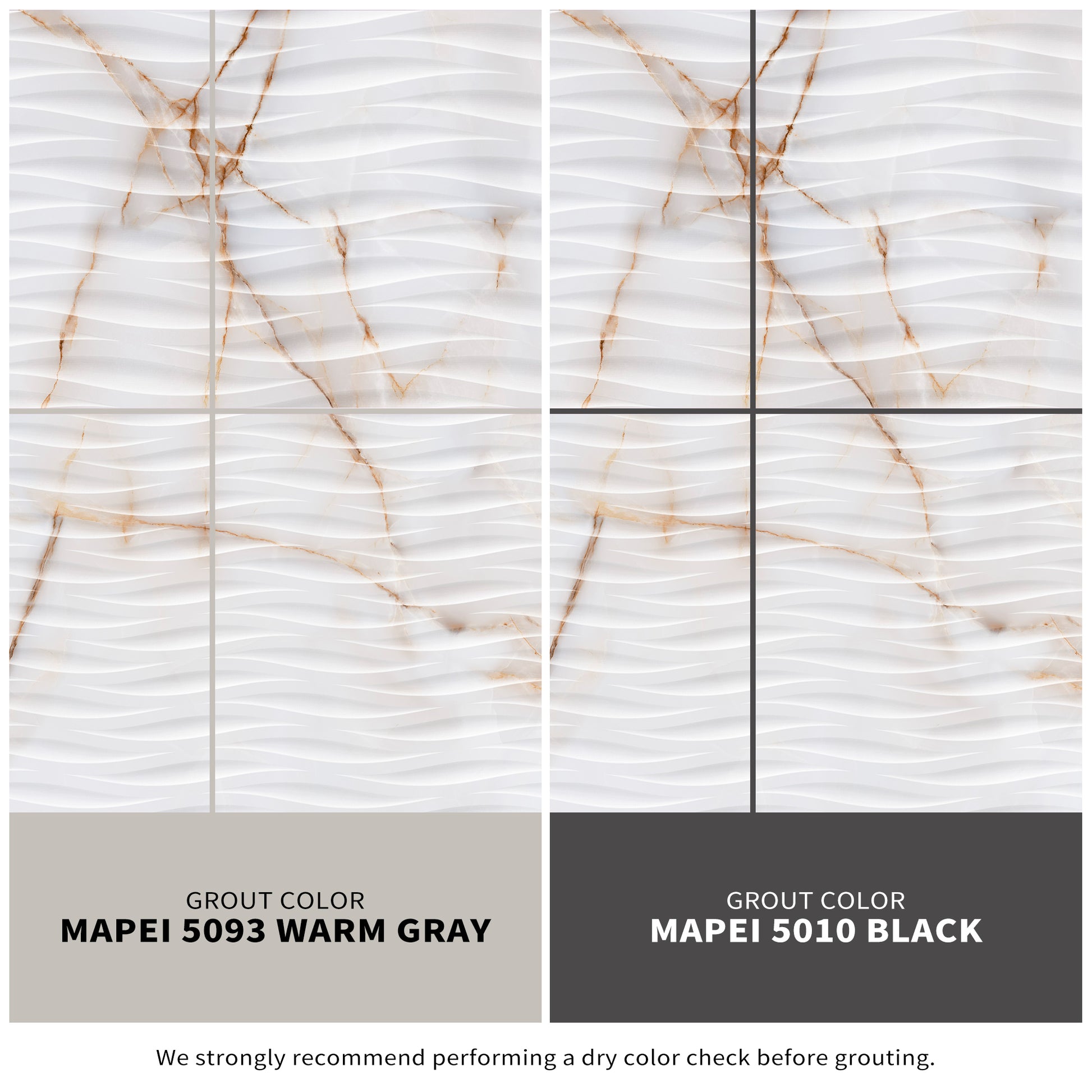 Highlight: Onyx-inspired marble-look porcelain tile with glossy veins; Graceful undulations bring movement and visual texture to space