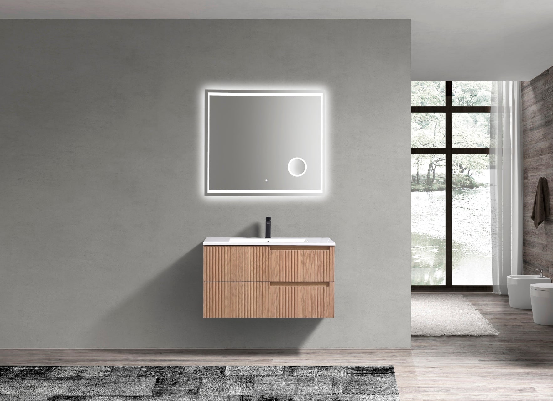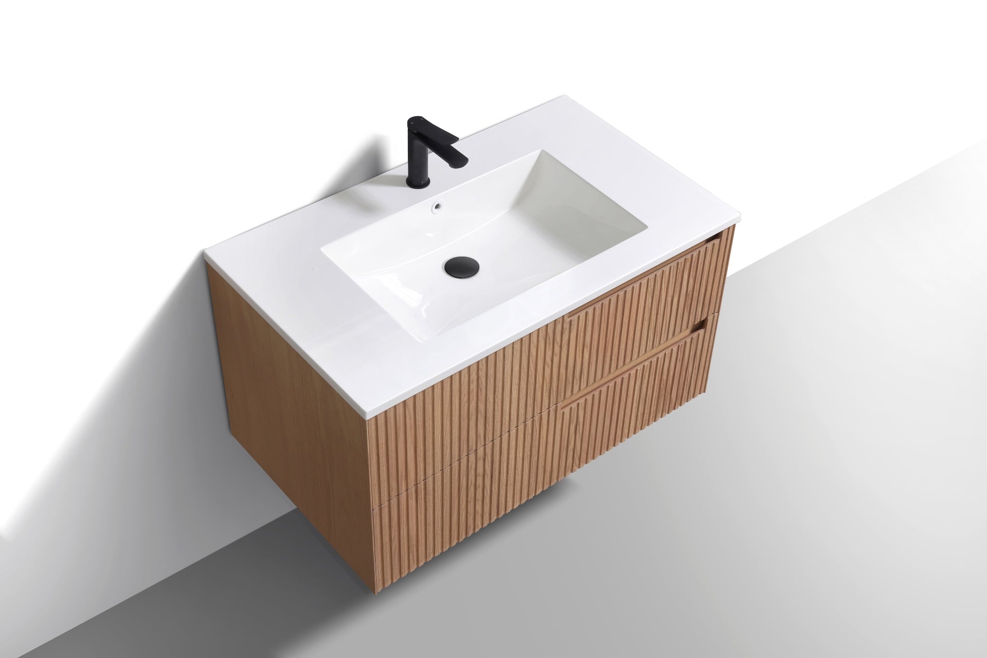 The 32" Fiore Modern Wall-Mount Bathroom Vanity in Oakwood combines contemporary style with practical functionality. The sleek wall-mounted design creates a clean, spacious look, perfect for modern bathrooms. Its rich oakwood finish adds warmth, seamlessly complementing a variety of tile styles, whether you prefer subtle porcelain tiles, trendy subway tiles, or vibrant mosaics. This vanity offers convenient storage and a refined aesthetic that fits well with both minimalist and bold bathroom designs.