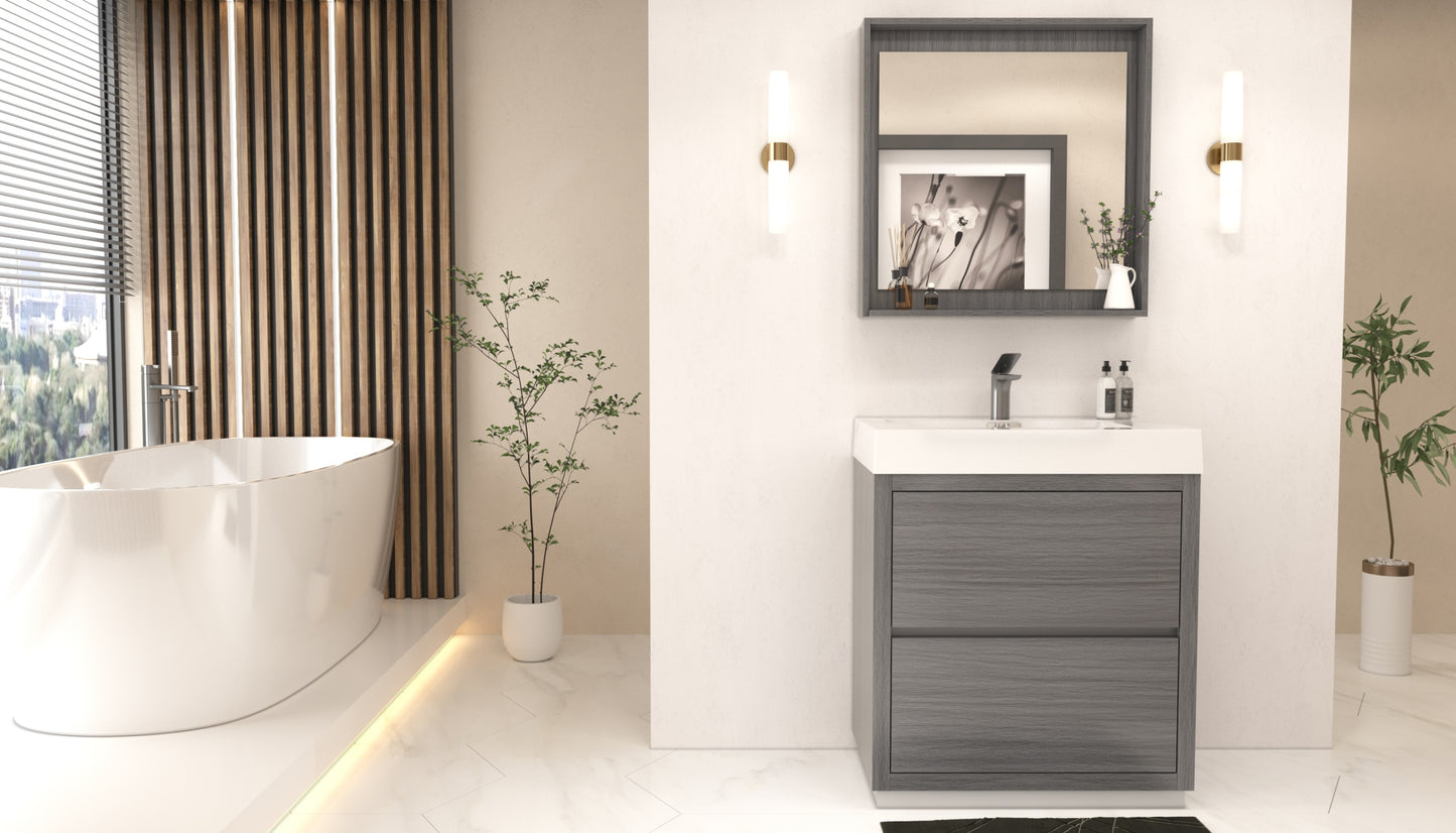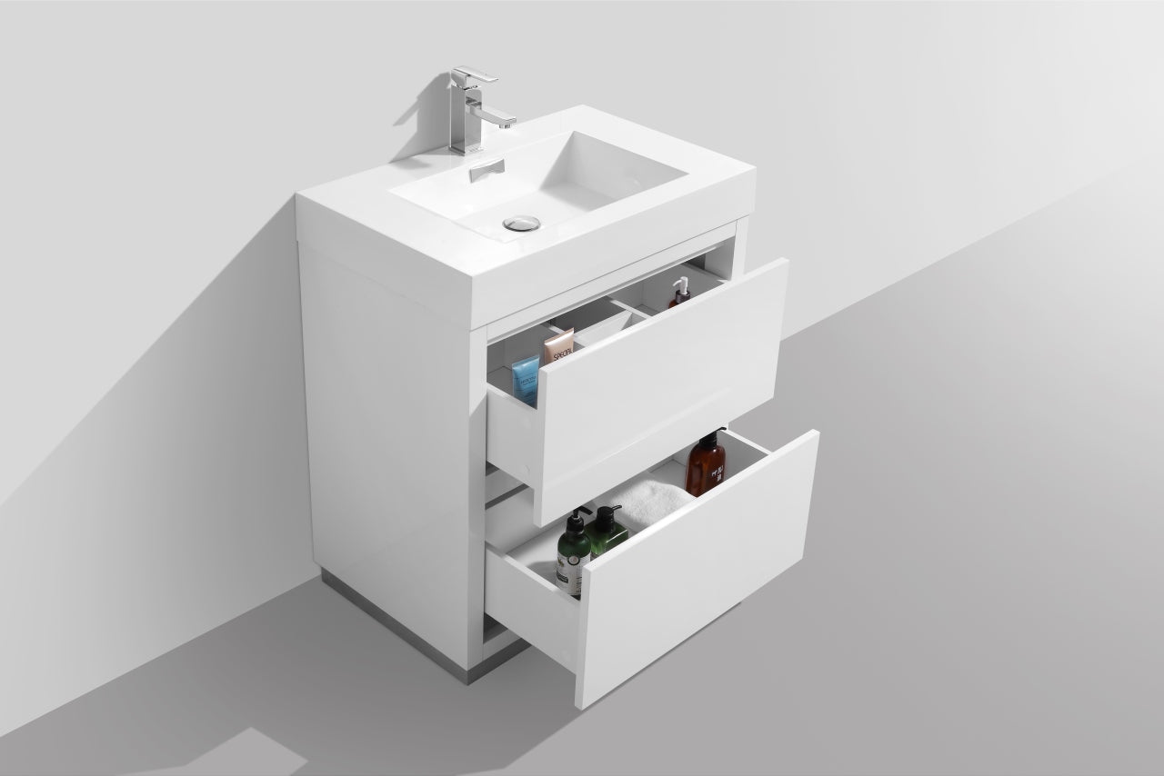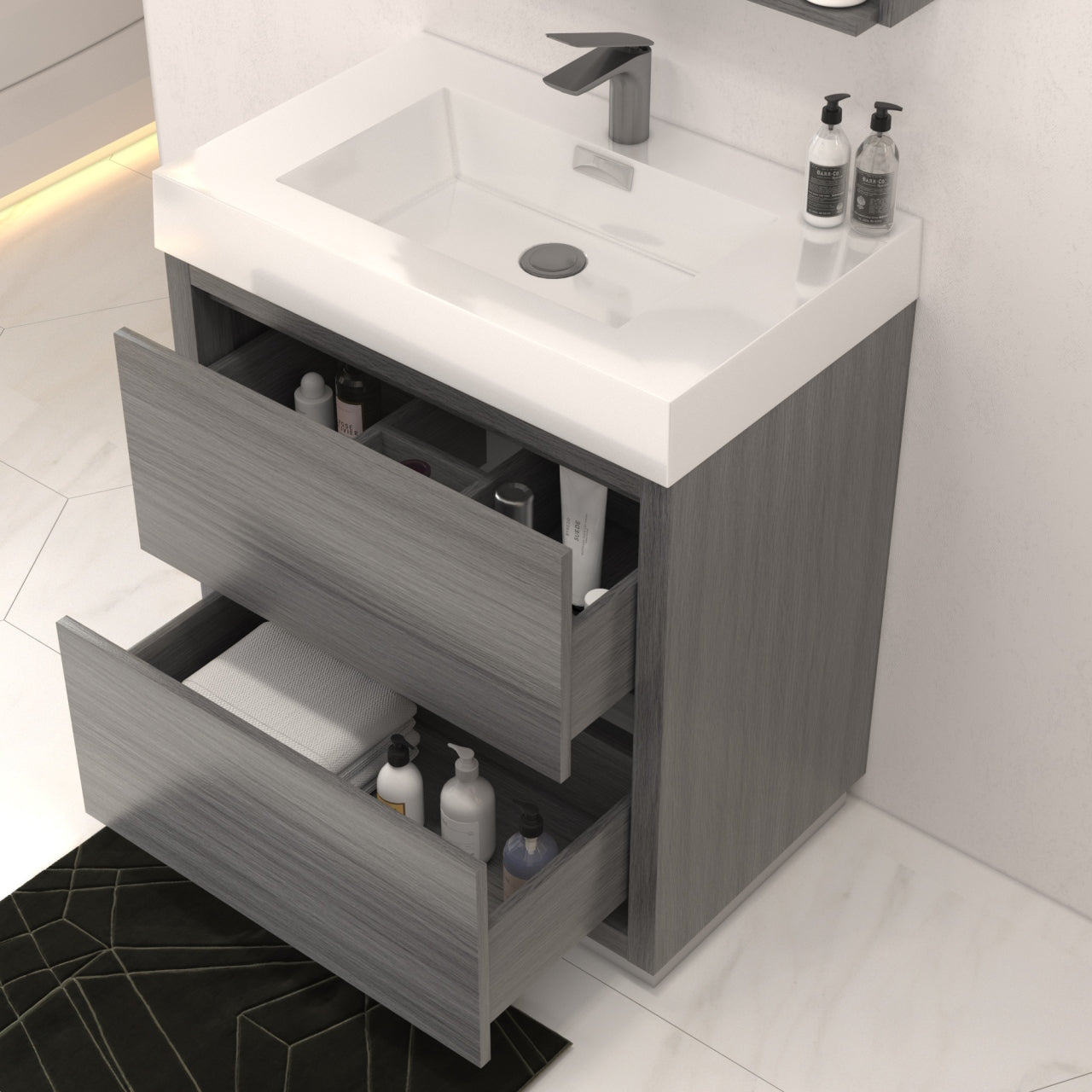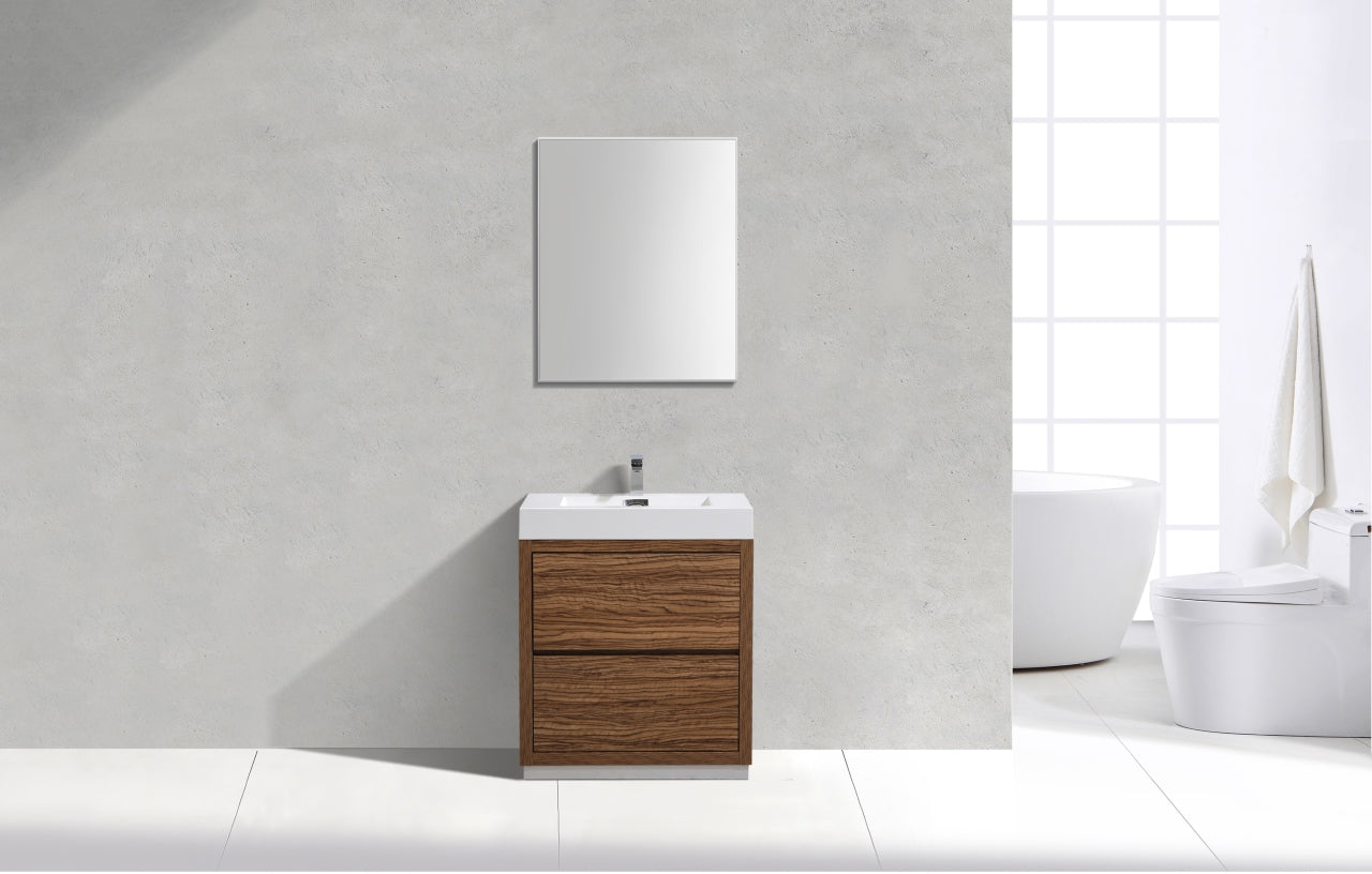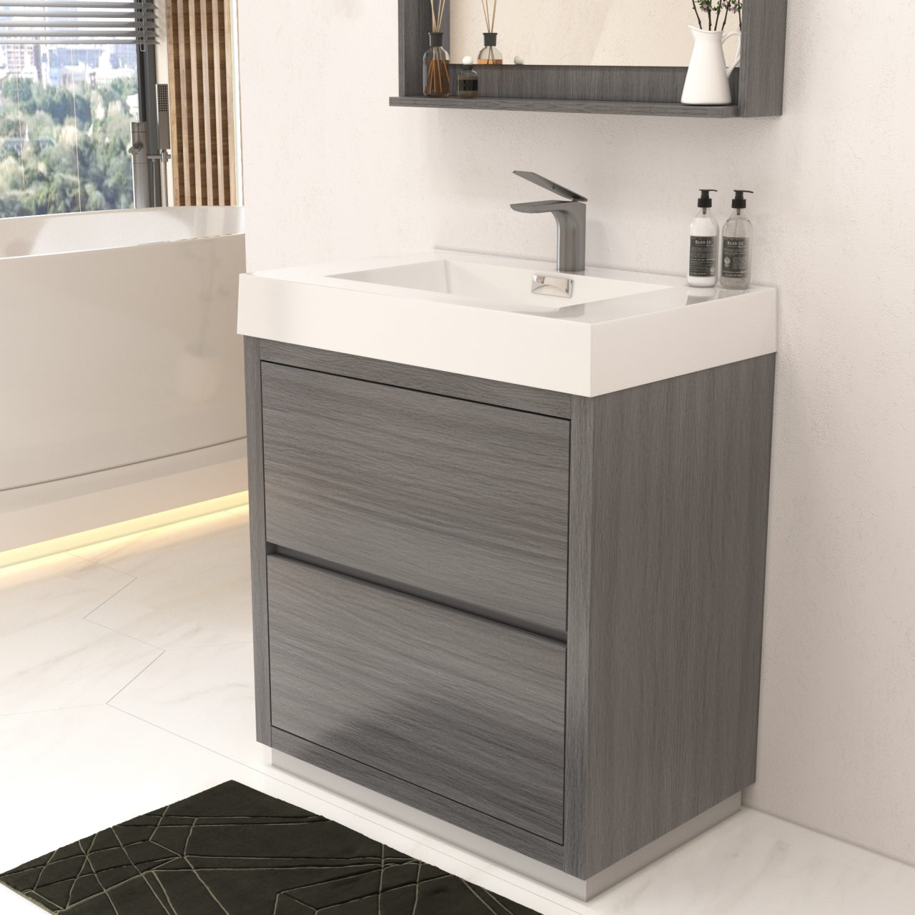 Upgrade your bathroom with the Bliss 30" Free-Standing Modern Bathroom Vanity, a sleek and functional centerpiece designed to enhance any space. Crafted with clean lines and contemporary elegance, this vanity pairs seamlessly with a variety of tile choices, from classic subway tiles to bold mosaic patterns. Its smooth, durable finish complements both porcelain and natural stone tiles, creating a stylish contrast or a harmonious blend, depending on your design vision. The spacious countertop offers ample room for daily essentials, while the soft-closing drawers provide organized storage without compromising on style.