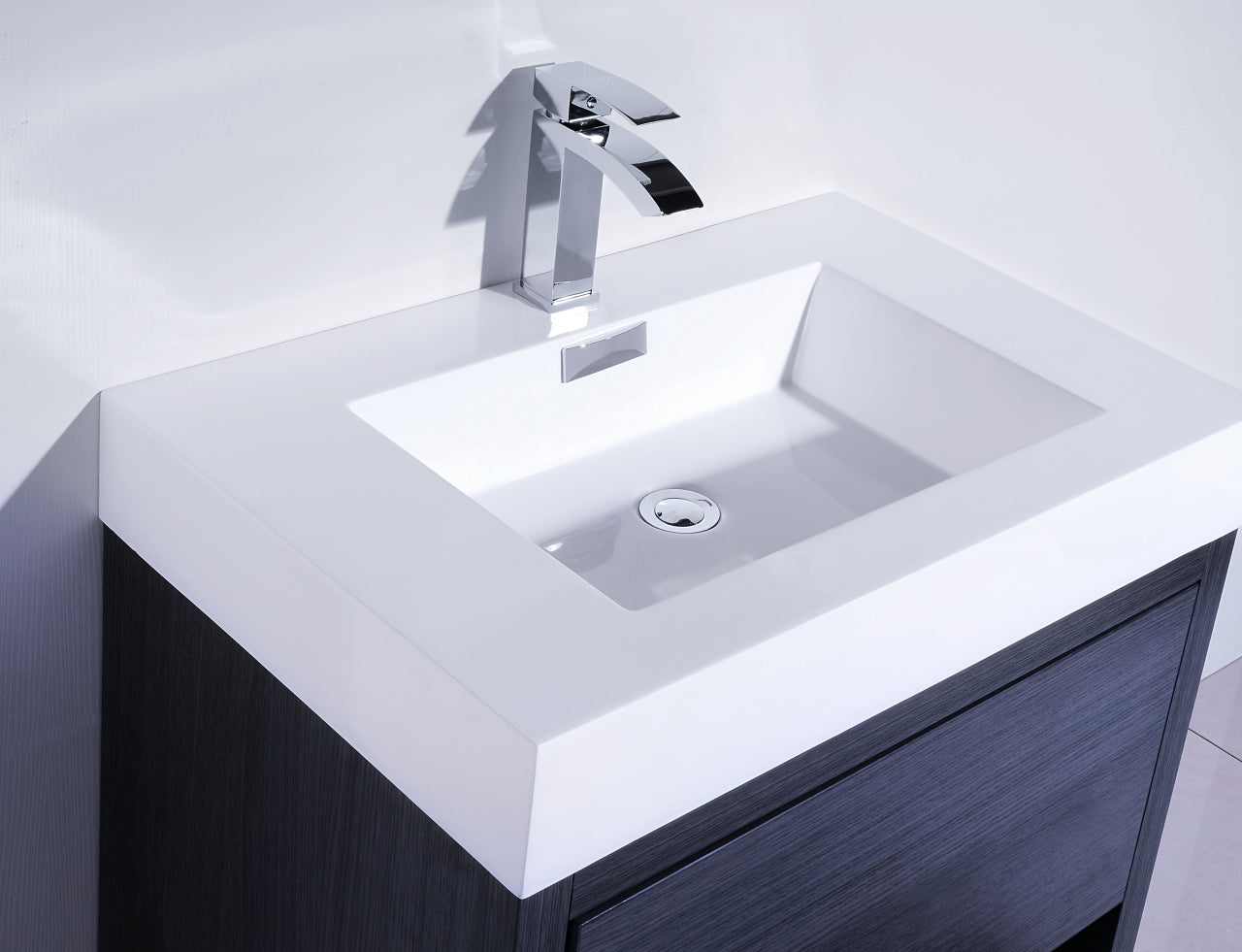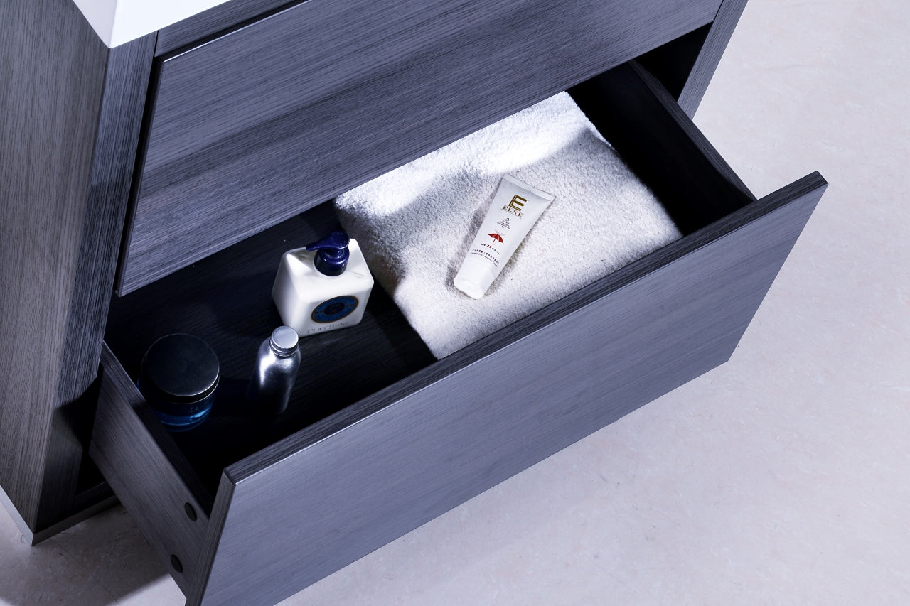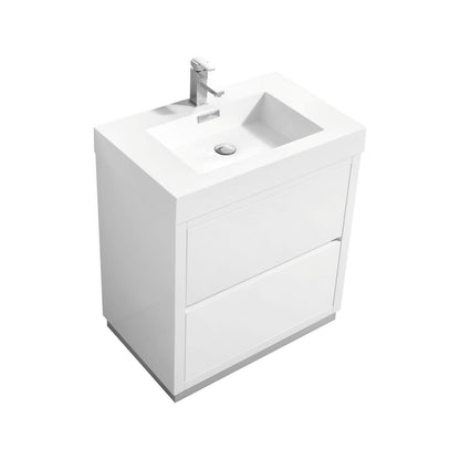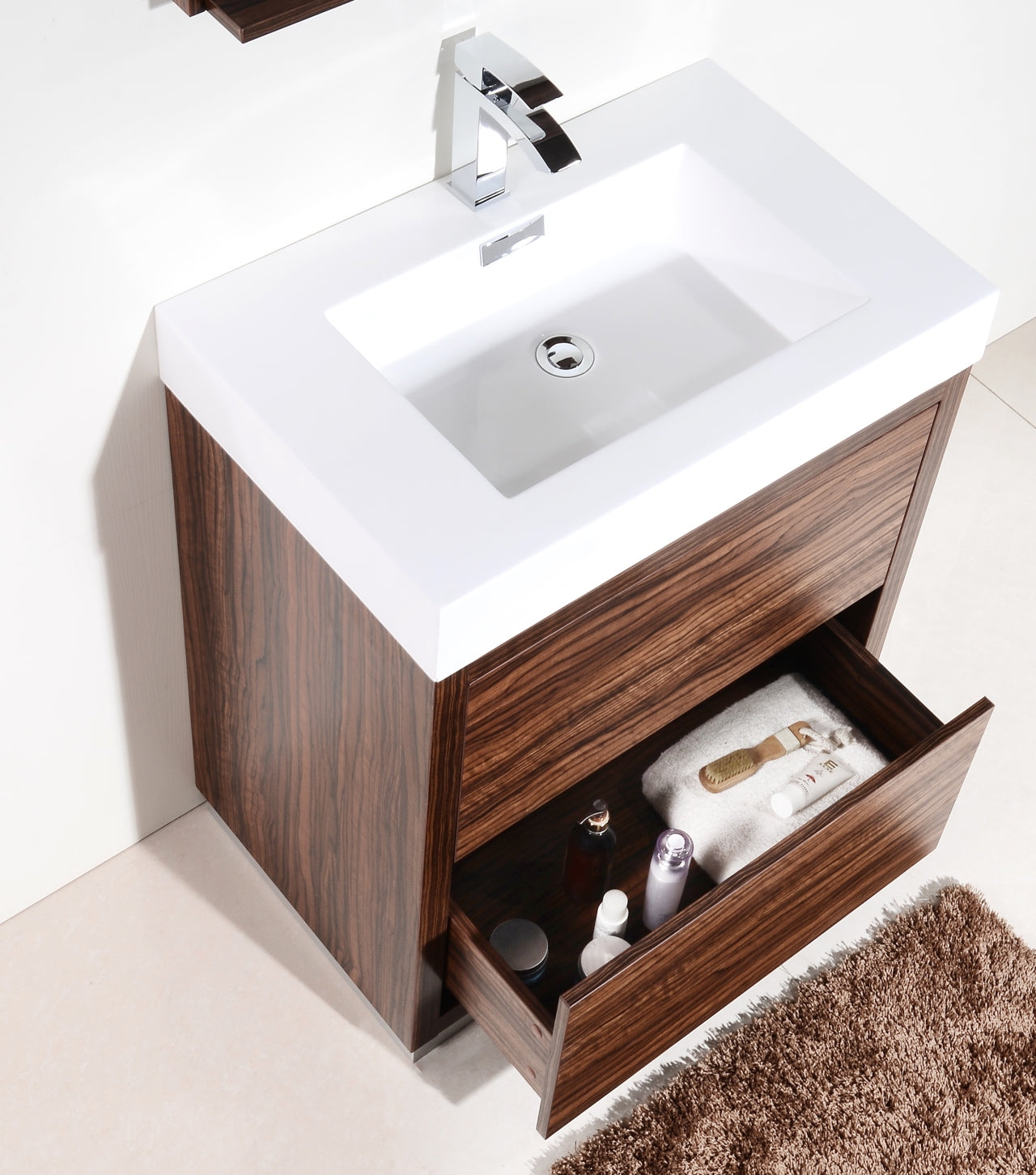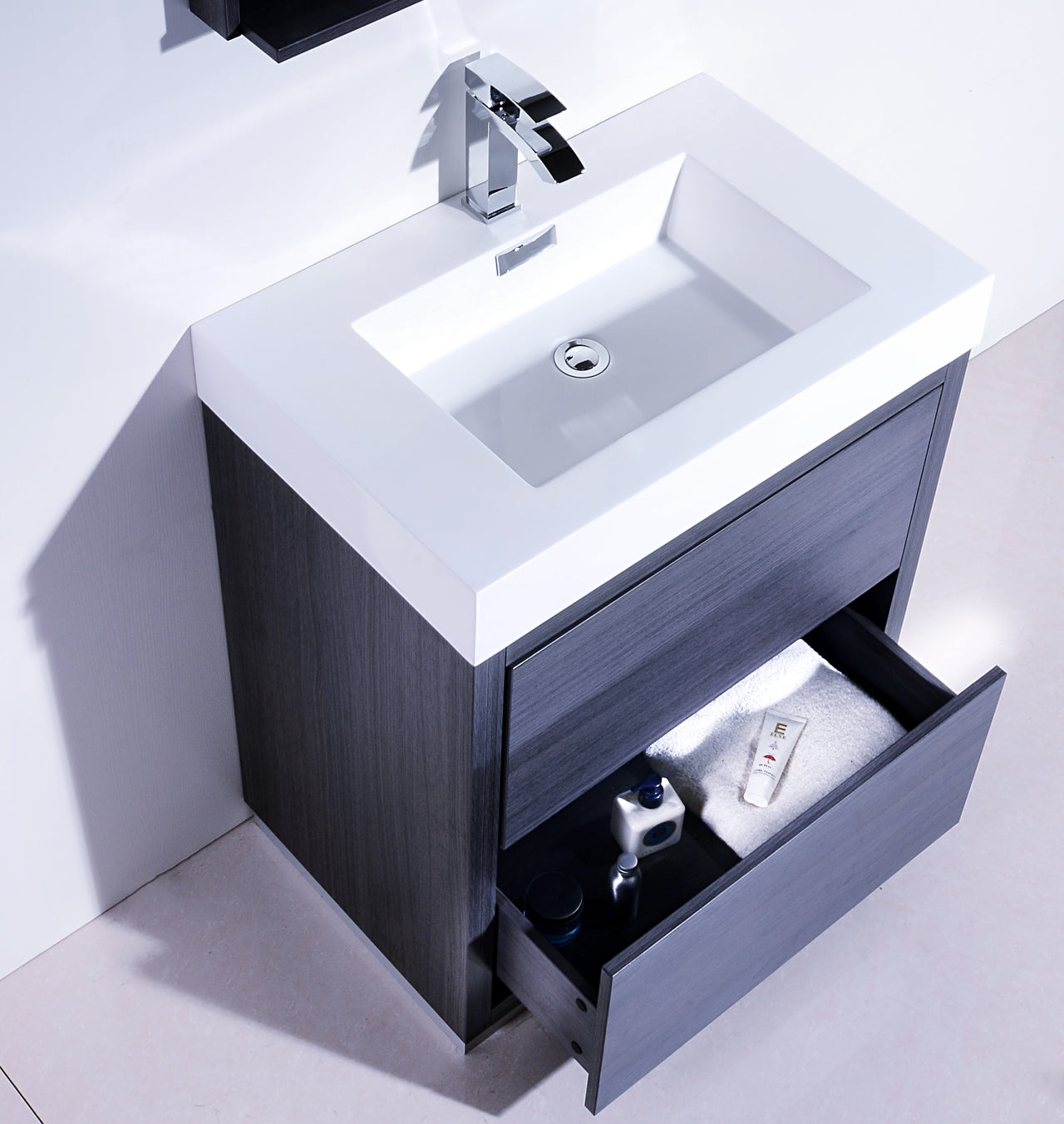Upgrade your bathroom with the Bliss 30" Free-Standing Modern Bathroom Vanity, a sleek and functional centerpiece designed to enhance any space. Crafted with clean lines and contemporary elegance, this vanity pairs seamlessly with a variety of tile choices, from classic subway tiles to bold mosaic patterns. Its smooth, durable finish complements both porcelain and natural stone tiles, creating a stylish contrast or a harmonious blend, depending on your design vision. The spacious countertop offers ample room for daily essentials, while the soft-closing drawers provide organized storage without compromising on style.